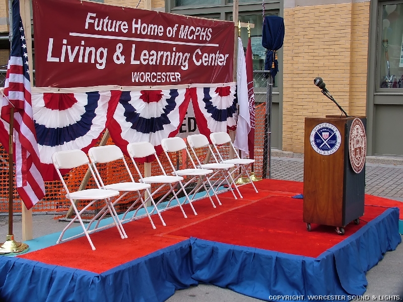 | STAGE, RED CARPET, PODIUM, SOUND, CHAIRS, RED/WHITE/BLUE BUNTING, US & MASSACHUSETTS STATE FLAGS |