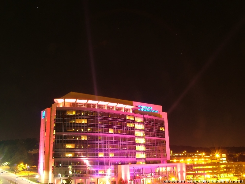 | STRUCTURE ILLUMINATION Final Product: Breast Cancer Awareness Month at the University of Massachusetts (UMass)/Memorial, Worcester, with floodlights and colored searchlights. |