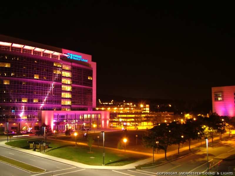Final Product: Breast Cancer Awareness Month at the University of Massachusetts (UMass)/Memorial, Worcester, with floodlights and colored searchlights.