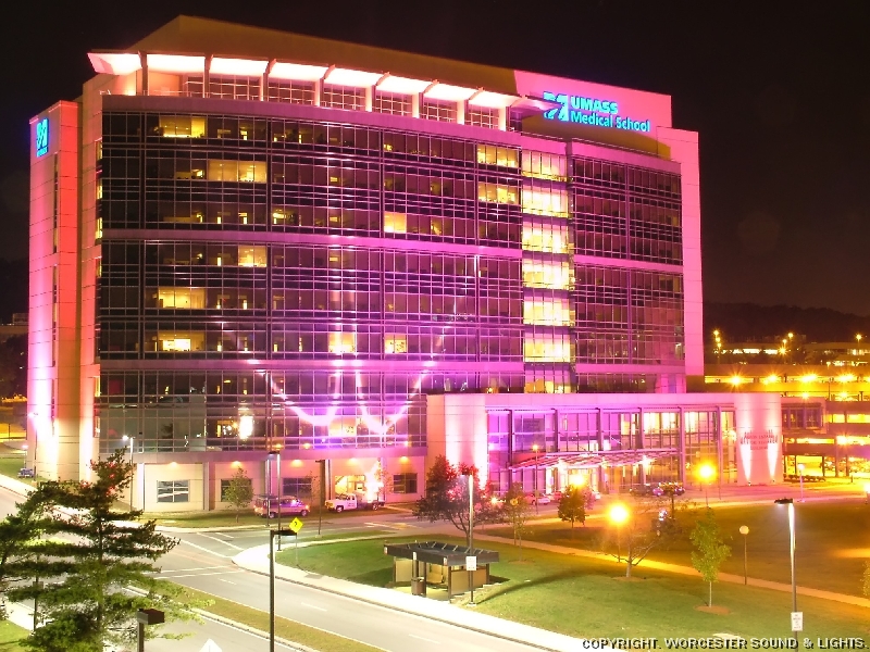 | STRUCTURE ILLUMINATION Final Product: Breast Cancer Awareness Month at the University of Massachusetts (UMass)/Memorial, Worcester, with floodlights and colored searchlights. |